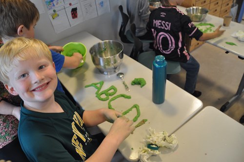 De har samarbejdet, fulgt en opskrift nøje for at få den helt rette konsistens, og udformet tal, bogstaver og små ord i deres slim. Der var selvfølgelig også tid til at lege fri fantasi med slimen, hvor der blandt andet blev tegnet monstre i slimen.